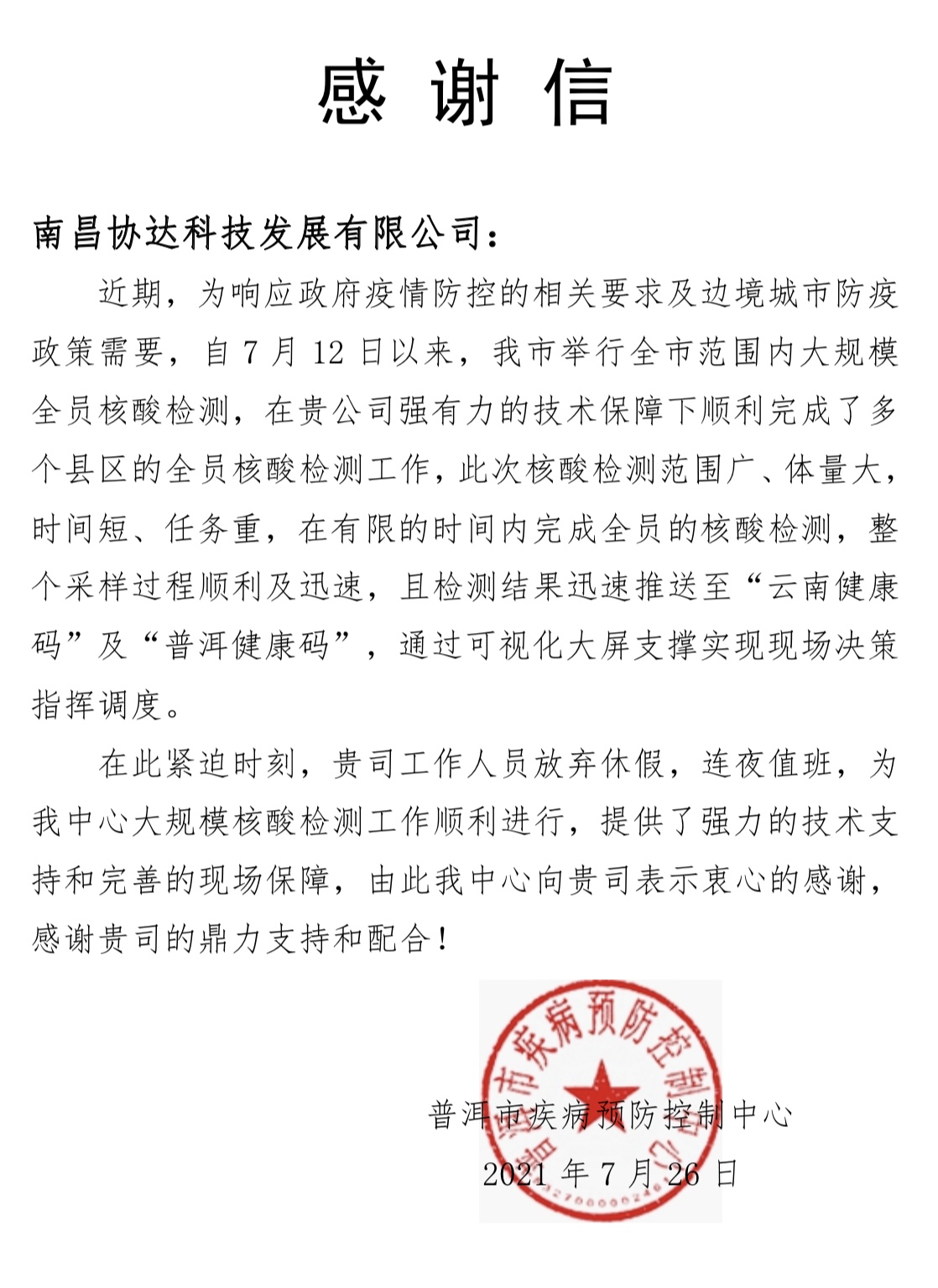 近日,我公司收到一封來(lái)自云南省普洱市疾控中心關(guān)于“技術(shù)保障云南邊境核酸檢測(cè)”的感謝信,我公司全體同仁除了感謝普洱市疾控中心肯定及信任之外,更多的是一份承諾和責(zé)任。多年來(lái),協(xié)達(dá)科技一直用“匠心”精神踐行“贏得客戶尊重”的理念,始終秉持“匠心”專(zhuān)注一個(gè)行業(yè)、一件事,不辜負(fù)行業(yè),不辜負(fù)未來(lái)。