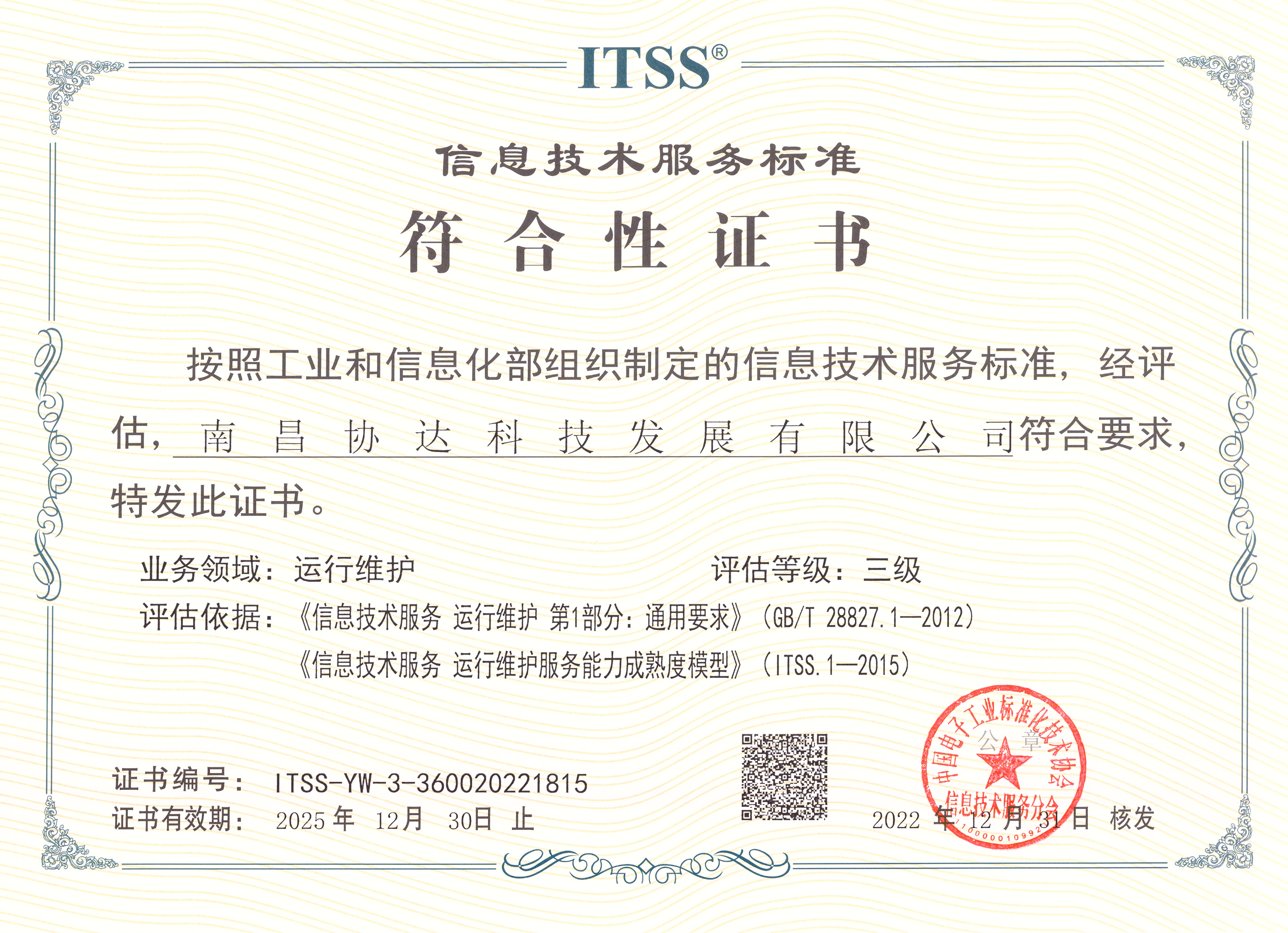 近日,南昌協(xié)達科技發(fā)展有限公司順利通過ITSS信息技術(shù)服務(wù)標準符合性評估三級認證,獲得“ITSS信息技術(shù)服務(wù)標準符合性證書”。